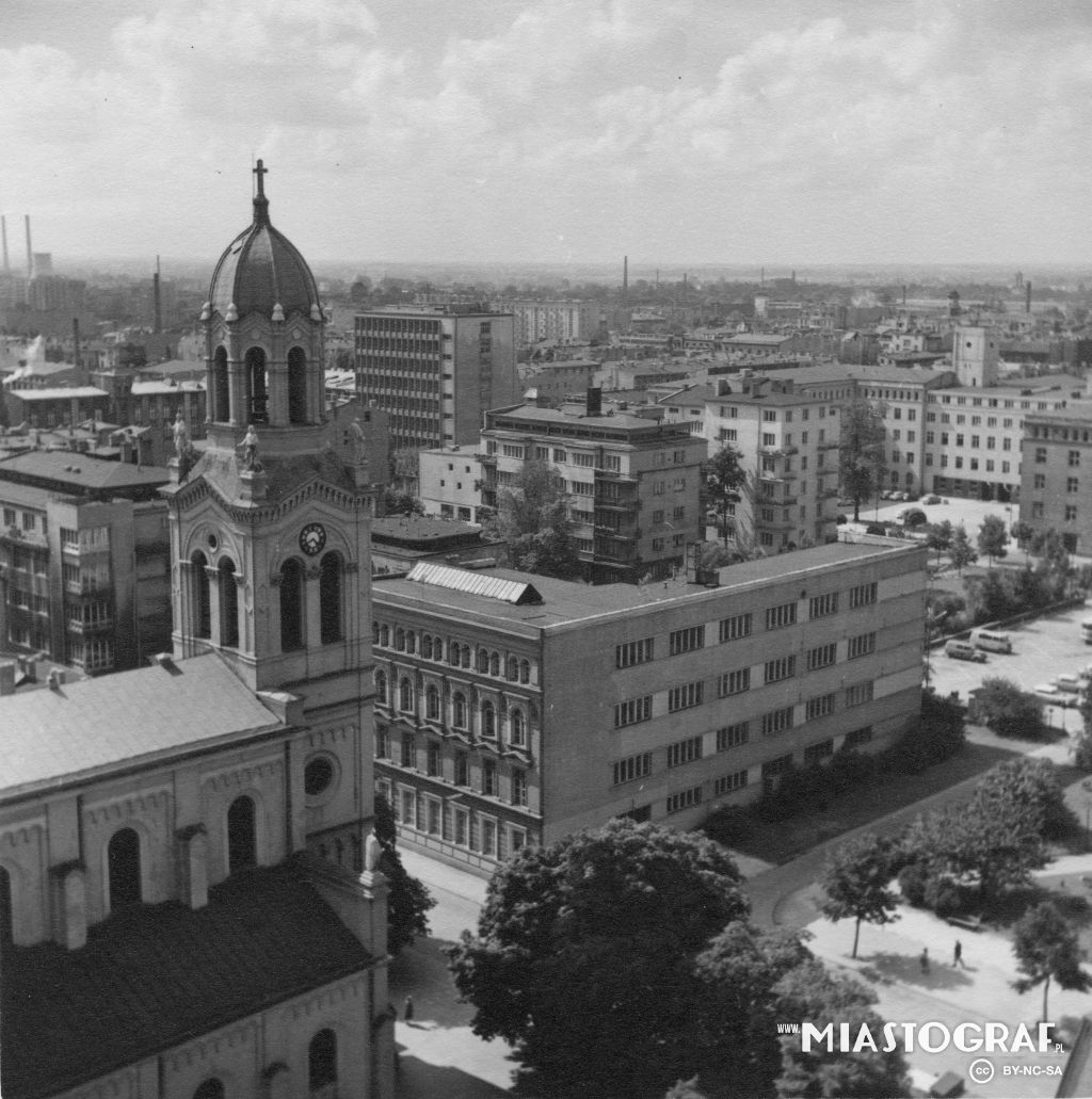 Widok z biurowca Biura Projektów Budownictwa Komunalnego w Łodzi w str. południowo wschodnią miasta. Po prawej zabudowania dawnej fabryki J. Heinzla przy ul. Piotrkowskiej 104 - widok od podwórka.