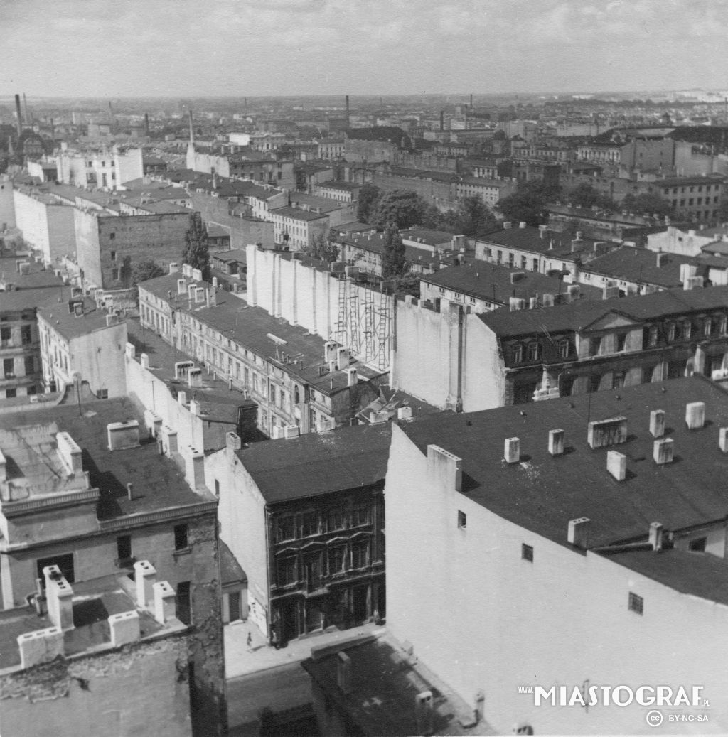 Widok z biurowca Biura Projektów Budownictwa Komunalnego w Łodzi w str. zachodnią miasta. U dołu zdj. biegnie ul. Sienkiewicza.