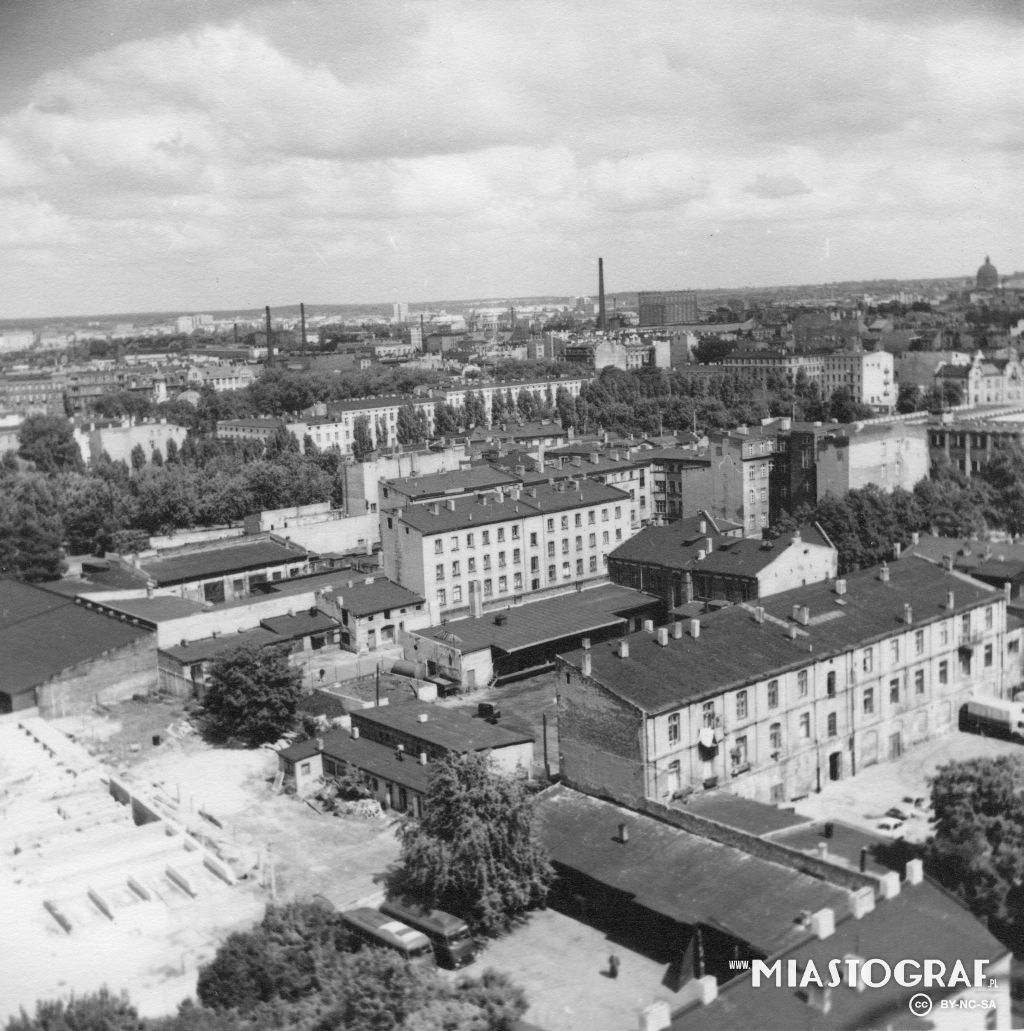 Widok z "Adasia" na dachy domów przy ul. Piotrkowskiej 177 i 179 w dali al. Kościuszki, widoczny dom partii.