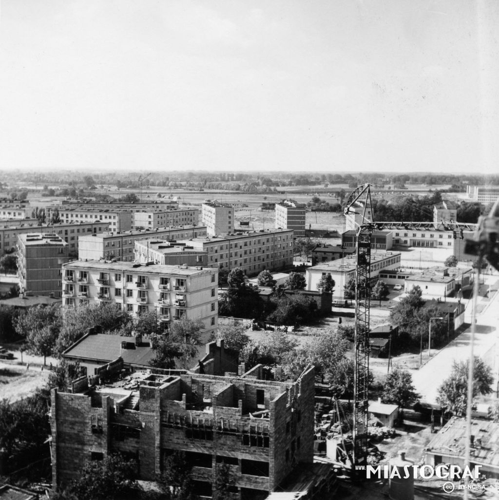 Blok przy ul. Spornej 72. Widok w str. ul. Wojska Polskiego.Widoczny Szpital Kliniczny Nr 4 im. Marii Konopnickiej i kopuła kościoła Św. Teresy od Dzieciątka Jezus i Św. Jana Bosko . Ulica Sporna zos...
