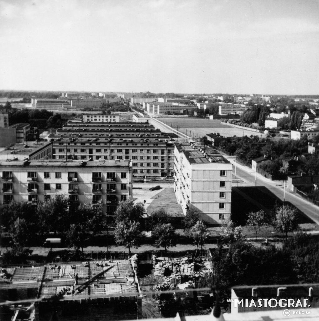 Blok przy ul. Spornej 72. Widok w str. ul. Wojska Polskiego.Widoczny Szpital Kliniczny Nr 4 im. Marii Konopnickiej i kopuła kościoła Św. Teresy od Dzieciątka Jezus i Św. Jana Bosko . Ulica Sporna zos...