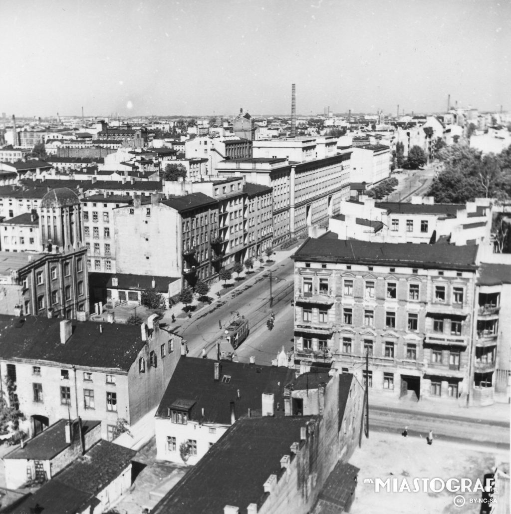 Widok z "Adasia" na dachy domów przy ul. Piotrkowskiej 177 i 179 w dali al. Kościuszki, widoczny dom partii.