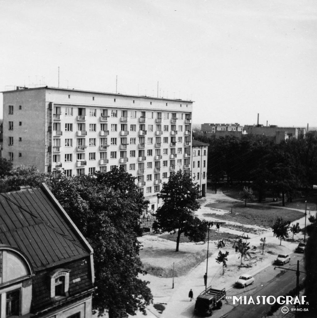 Widok na blok przy ul. Spornej 72 i wieżowiec przy ul. Boya-Żeleńskiego 12. Ulica Sporna została wytyczona w l. 70. XIX w. na terenie dawnej osady smolarskiej Kusy Kąt, położonej w pobliżu drogi do Br...