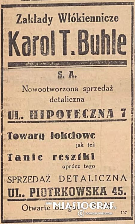 Wycinek z Gazety Łódzkiej (wydawanej pod okupacją niemiecką) reklamujący nowootwarty sklepu ze sprzedażą detaliczną Zakładów Włókienniczych Karol T. Buhle.