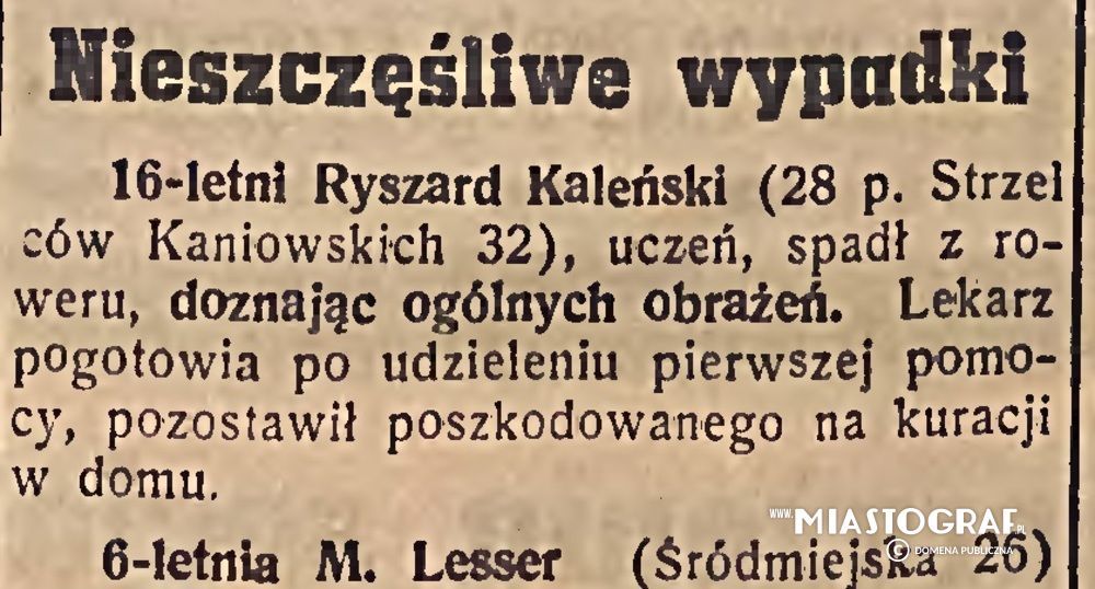 Wycinek z Gazety Łódzkiej (wydawanej pod okupacją niemiecką) inofrmujący o wypadek rowerowym na ul. Strzelców Kaniowskich.