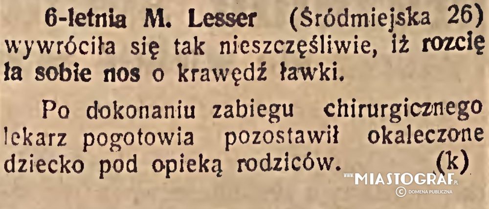 Wycinek z Gazety Łódzkiej (wydawanej pod okupacją niemiecką) informujący o wypadku 6 letniej dziewczynki na ulicy Śródmiejskiej 26 (obecnie Więckowskiego).