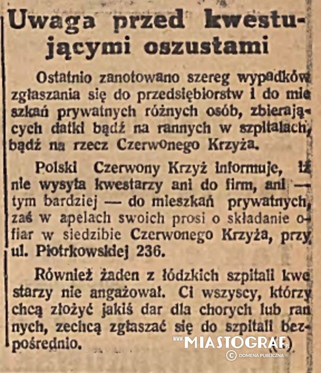 Wycinek z Gazety Łódzkiej (wydawanej pod okupacją niemiecką) informujący o łódzkich oszustach, zbierających datki na Polski Czerwony Krzyż. Informacja ta zdradza nam, gdzie ówczas znajdowała się ta organizacja - była to ul. Piotrkowska 236.