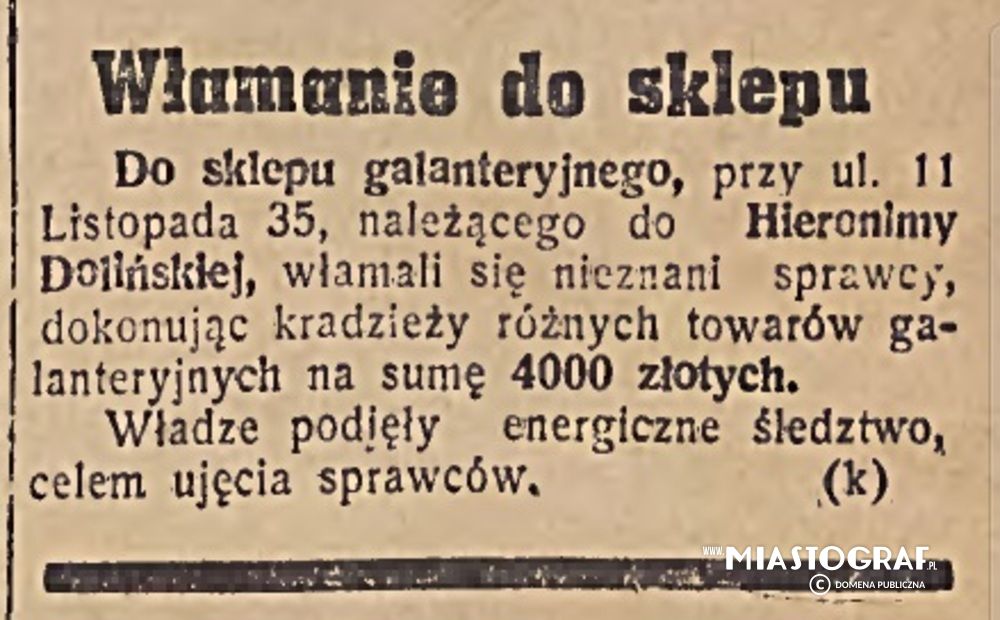 Wycinek z Gazety Łódzkiej (wydawanej pod okupacją niemiecką) inofrmujący o włamaniu do sklepu galarentyjnego przy ulicy 11 listopada 35.