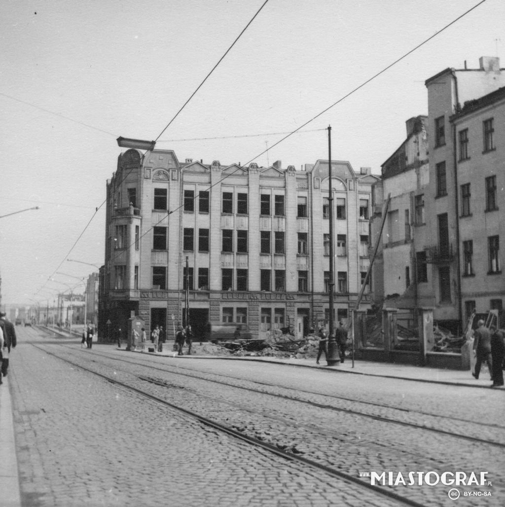 Przebudowa ul. Zachodniej przy ul. Próchnika. Widoczny fr. budynku to dawny hotel Bristol stojący przy ul. Zawadzkiej 11 róg Zachodniej.