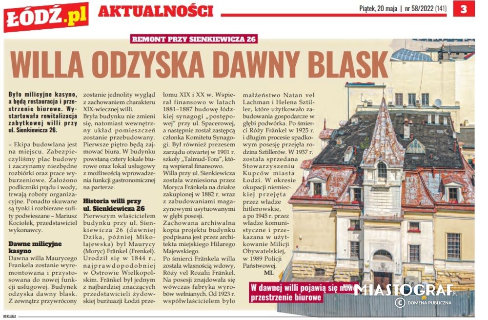 Wycinek prasowy z gazety Łódź.pl inofrmujący o rewitalizacji zabytkowej willi Maurycego Frankela przy ul. Sienkiewicza 26.