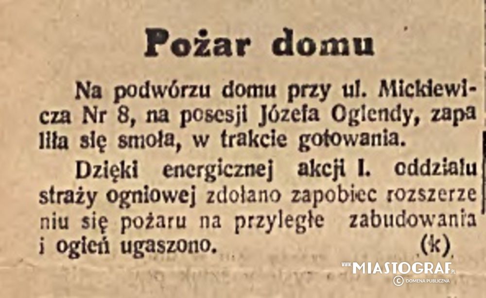 Wycinek z Gazety Łódzkiej (wydawanej pod okupacją niemiecką) informujący o pożarze domu przy ulicy Mickiewicza 8.