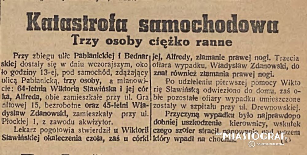 Wycinek z Gazety Łódzkiej (wydawanej pod okupacją niemiecką) inforumujący o wypadku samochodowym na skrzyżowaniu ulicy Pabianickiej i Bedarskiej, w wyniku której ucierpiały 3 osoby.