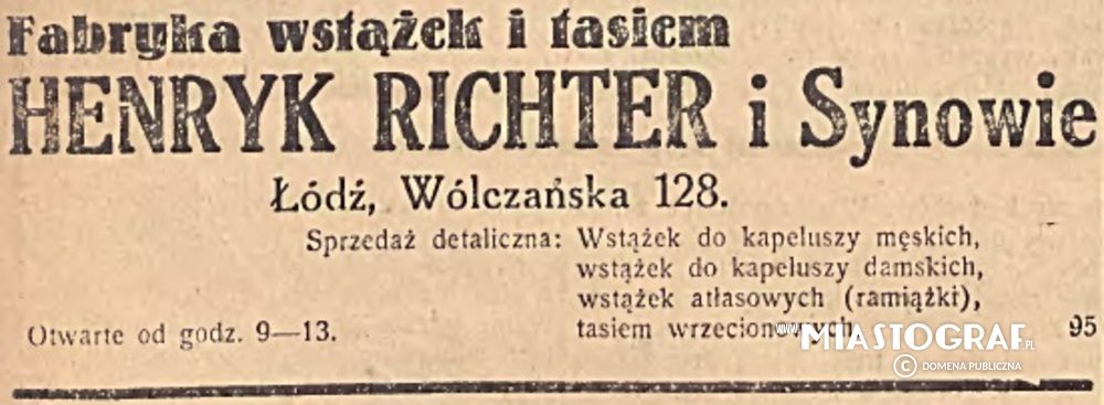 Wycinek z Gazety Łódzkiej (wydawanej pod okupacją niemiecką) reklamujący fabrykę wstążek i tasiem Henryk Ritcher i Synowie na ul. Wólczańskiej 128. Firma oferowała sprzedaż detaliczną.