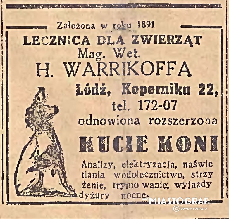 Wycinek z Gazety Łódzkiej wydawanej pod okupacją niemiecką, reklamujący lecznicę dla zwierząt Hugo Warrikofa przy ul. Kopernika 22. Zakład założony został w roku 1891 i istnieje do dziś, pod nazwą Lecznica Dla Zwierząt "Pod Koniem".