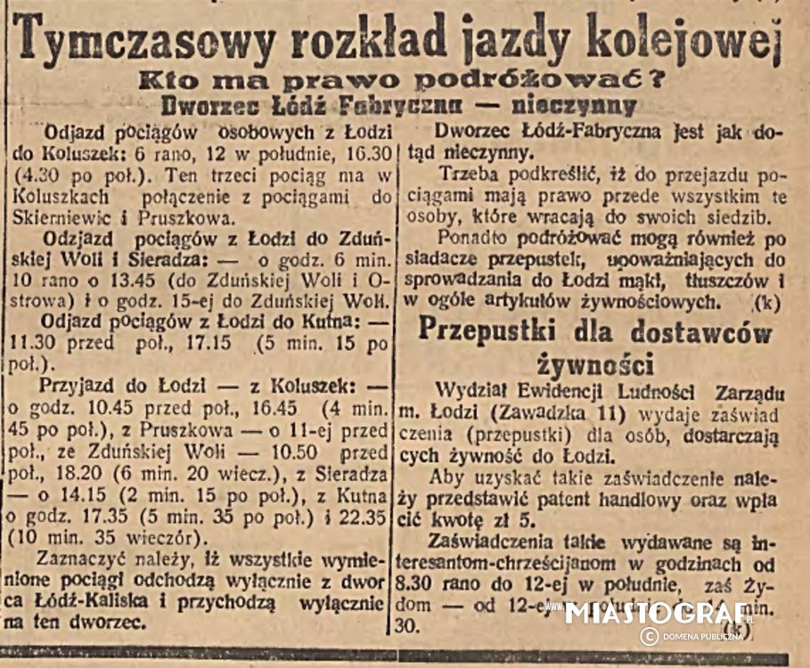 Wycinek z Gazety Łódzkiej wydawanej pod okupacją niemiecką informujący o rozkładzie kolejwoym naszego miasta. Komunikacja możlwia była jedynie z Łodzi-Kaliskiej, dworzec Łódź Fabryczna była wtedy nieczynna.
