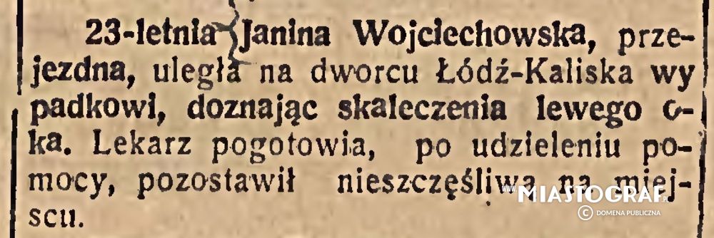 Wycinek z Gazety Łódzkiej wydawanej pod okupacją niemiecką informujący o wypadku młodej kobiety na dworcu Łódz Kaliska.