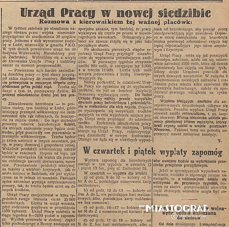 Wycinek z Gazety Łódzkiej wydawanej pod okupacją niemiecką będący wywiadem z kierownikiem nowo powstałego urzędu pracy, którego okupanci umiejscowili w Manufakturze. Wg. artykułu w Łodzi "pominąwszy Żydów" pracy nie miało 25 procent mieszkańców, co związane było prawdopodobnie z kryzysem branży włókienniczej, jaki nastąpił po przejęciu miasta przez Rzeszę. Równoległym działaniem urzędu było wypłacanie zasiłków, a zatrudniony kierownik podkreśla fakt, iż te wysyłane są "żonom mężczyzn, którzy brali czynny udział w wojnie przeciwko Niemcom", któremu to faktowi "nie potrafią zaprzeczyć nawet zaślepieni fanatycy".