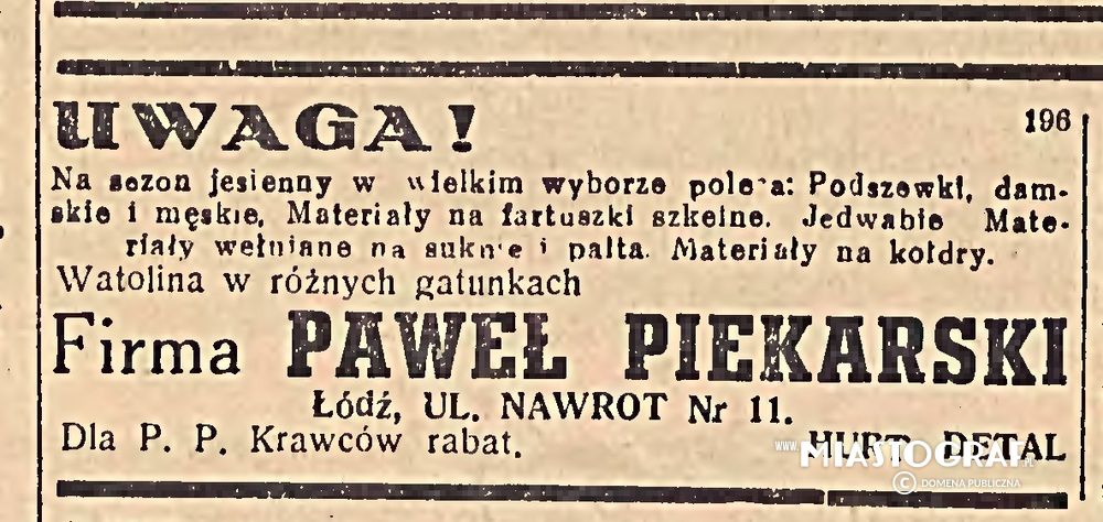 Wycinek z Gazety Łódzkiej wydawanej pod okupacją niemiecką reklamujący sklep z materiałami hurt detal Pawła Piekarskiego pod adresem Nawrota 11. Krawcom na produkty oferowany był rabat.