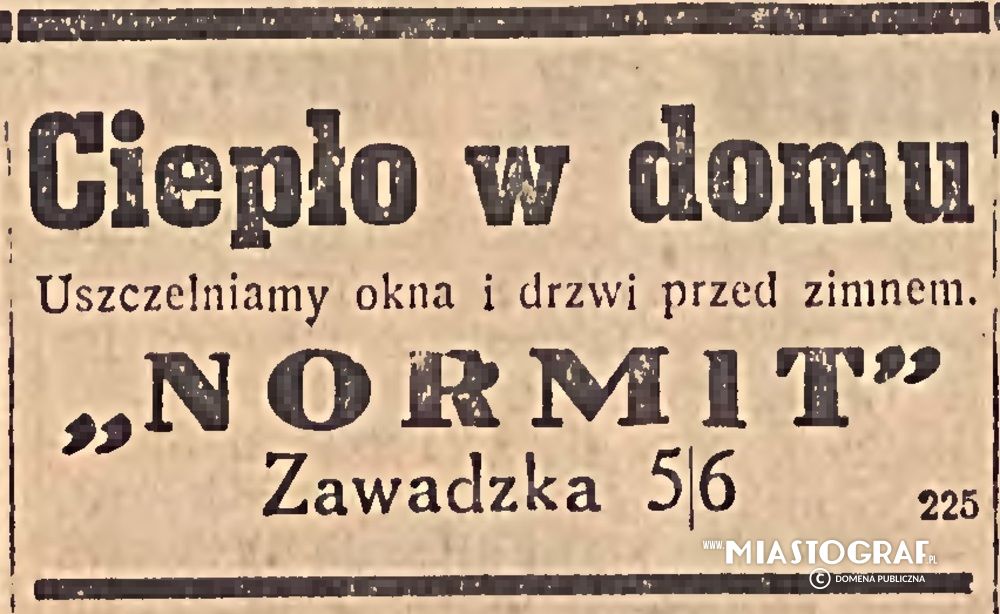 Wycinek z Gazety Łódzkiej wydawanej pod okupacją niemiecką reklamujący zakład uszczelniający okna i drzwi Normit. Przedsiębiorstwo znajdowało się pod adresem Zawadzka 5/6 (dziś Adama Próchnika).