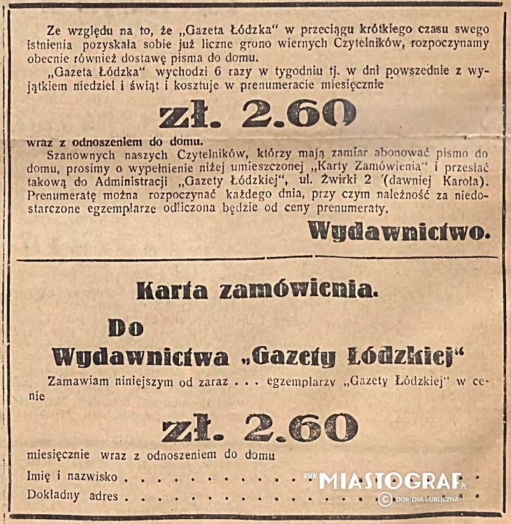 Wycinek z Gazety Łódzkiej wydawanej pod okupacją niemiecką, informujący, iż prenumerata gazety, w wyniku zdobycia pewnej popularności, była odtąd dostarczana bezpośrednio do domów. Opłata za miesięczną prenumeratę wynosiła 2.60 zł, a procesu abonacji dokonać można było w budynku administracji Gazety Łódzkiej pod adresem Żwirki 2.