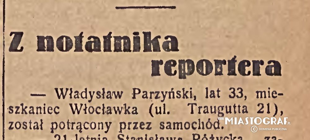 Wycinek z Gazety Łódzkiej wydawanej pod okupacją niemiecką, informujący o wypadku samochodowym na ul. Traugutta 21.