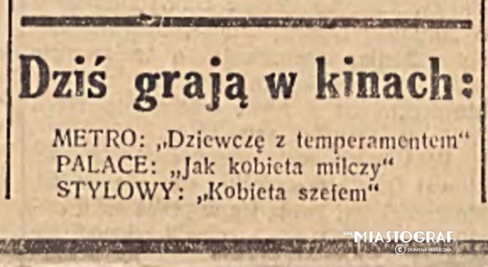 Wycinek z Gazety Łódzkiej wydawanej pod okupacją niemiecką informujący o filmach granych w trzech kinach: Metro (później znane jako kino Gdynia), Palace i Stylowy (wcześniej znane jako kino Resursa). Puszczane filmy to kolejno: "Kobieta z temperamentem", "Jak kobieta milczy" i "Kobieta szefem". Premiera jednego z tych filmów, wraz z krótkim opisem, została ogłoszona parę numerów wcześniej.