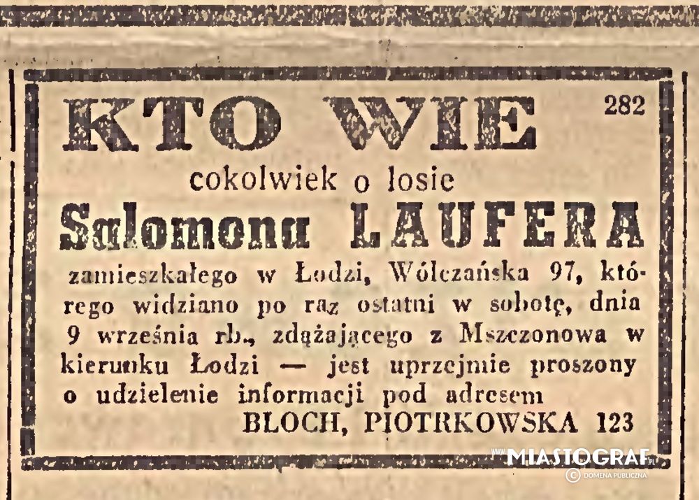 Wycinek z Gazety Łódzkiej wydawanej pod okupacją niemiecką, informujący o zaginięciu mieszkańca Łodzi - Salmona Laufera, zamieszkałego na Wólczańskiej 97. Ostatni raz widziano go w sobotę 9 września, zdążającego z Mszczowa w kierunku Łodzi.
