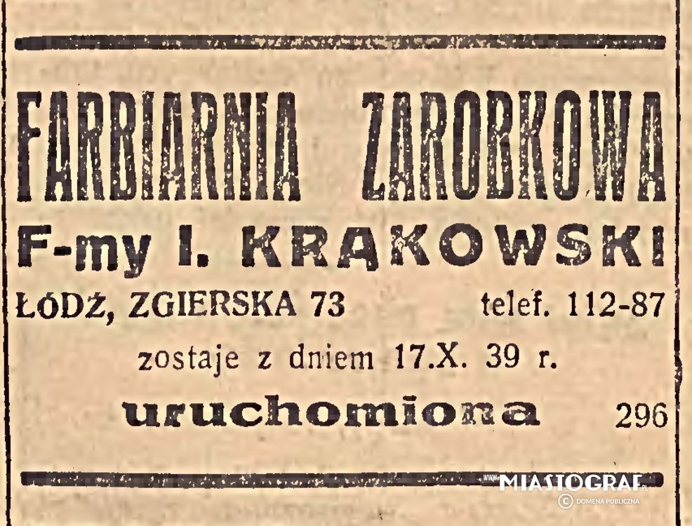 Wycinek z Gazety Łódzkiej wydawanej pod okupacją niemiecką reklamujący farbiarnię zarobkową I. Krakowskiego. Położona na Zgierskiej 73, działać miała od 17 października.