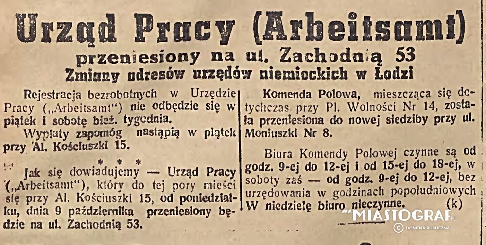 Wycinek z Gazety Łódzkiej wydawanej pod okupacją niemiecką, informujący o zmianie adresów urzędów. Urząd Pracy został przeniesiony z Al. Kościuszki 15 na Zachodnią 53, zaś Komenda Polowa z Placu Wolności 14 na Moniuszki 8.