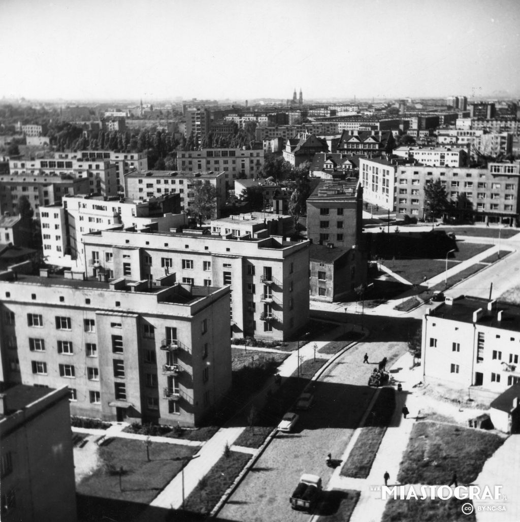 Widok na blok przy ul. Spornej 72 i wieżowiec przy ul. Boya-Żeleńskiego 12. Ulica Sporna została wytyczona w l. 70. XIX w. na terenie dawnej osady smolarskiej Kusy Kąt, położonej w pobliżu drogi do Br...