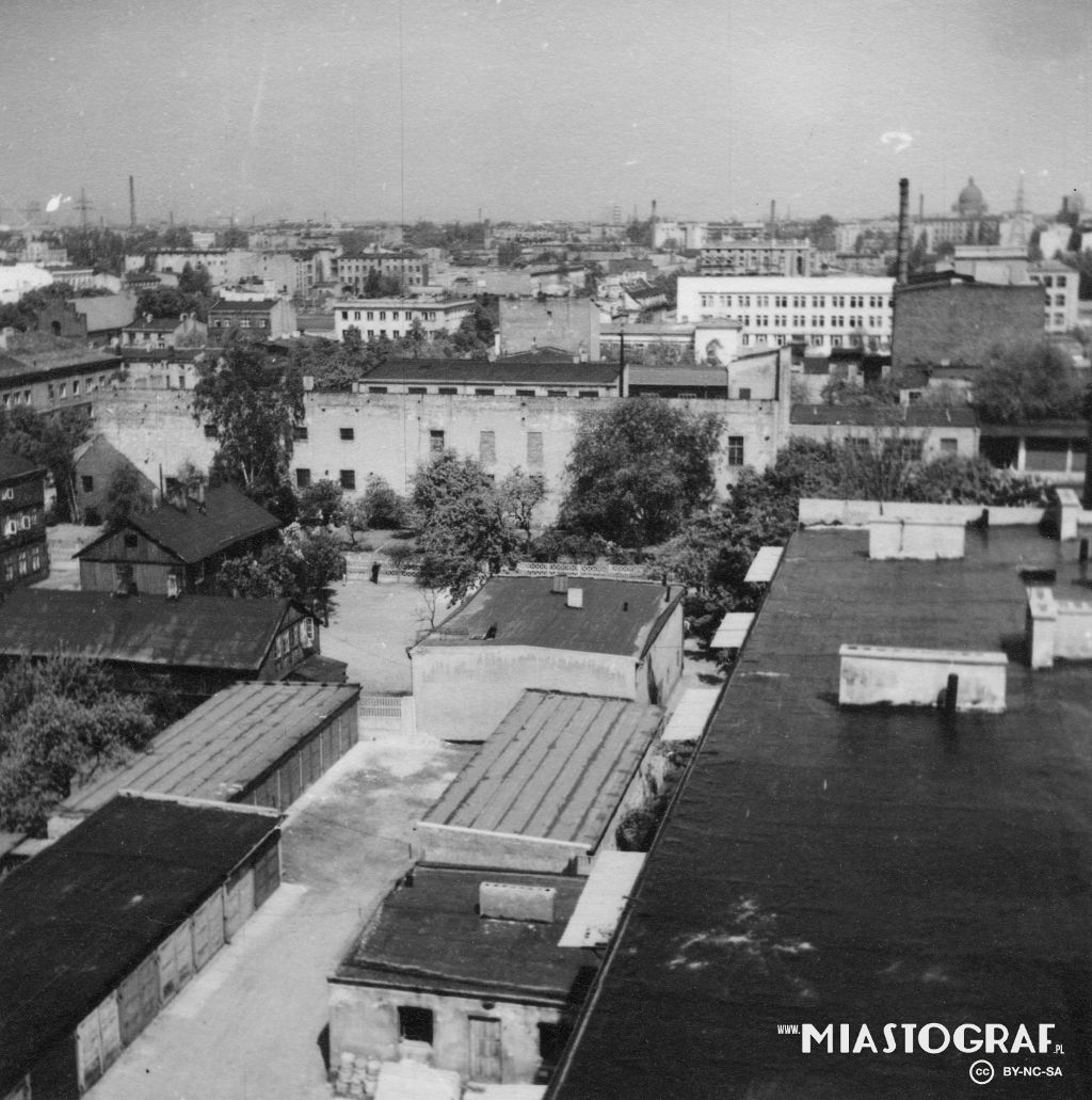 Widok z wieżowca przy ul. Kopcińskiego 93 i Armii Czerwonej w str. ul. Nawrot. Na horyzoncie widoczna kopuła Kościoła św. Teresy, a po lewej fr. elewacji dawnego kościoła mariawitów przy ul. Nawrot 104.