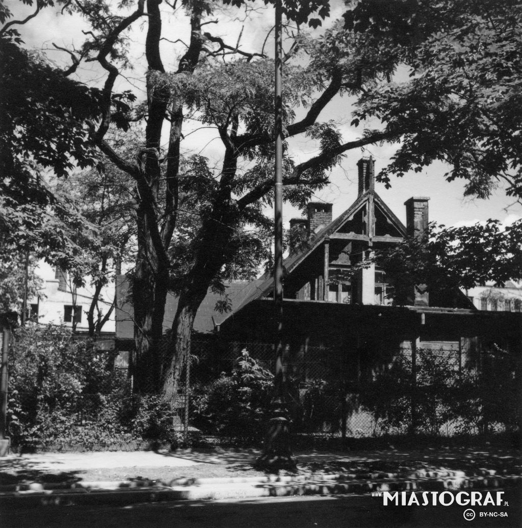 Drewniany domek przy ul. Orlej 2. W tle wieża kościoła św. Jana z ul. Sienkiewicza, a obok komin z dawnej fabryki J. Balle.