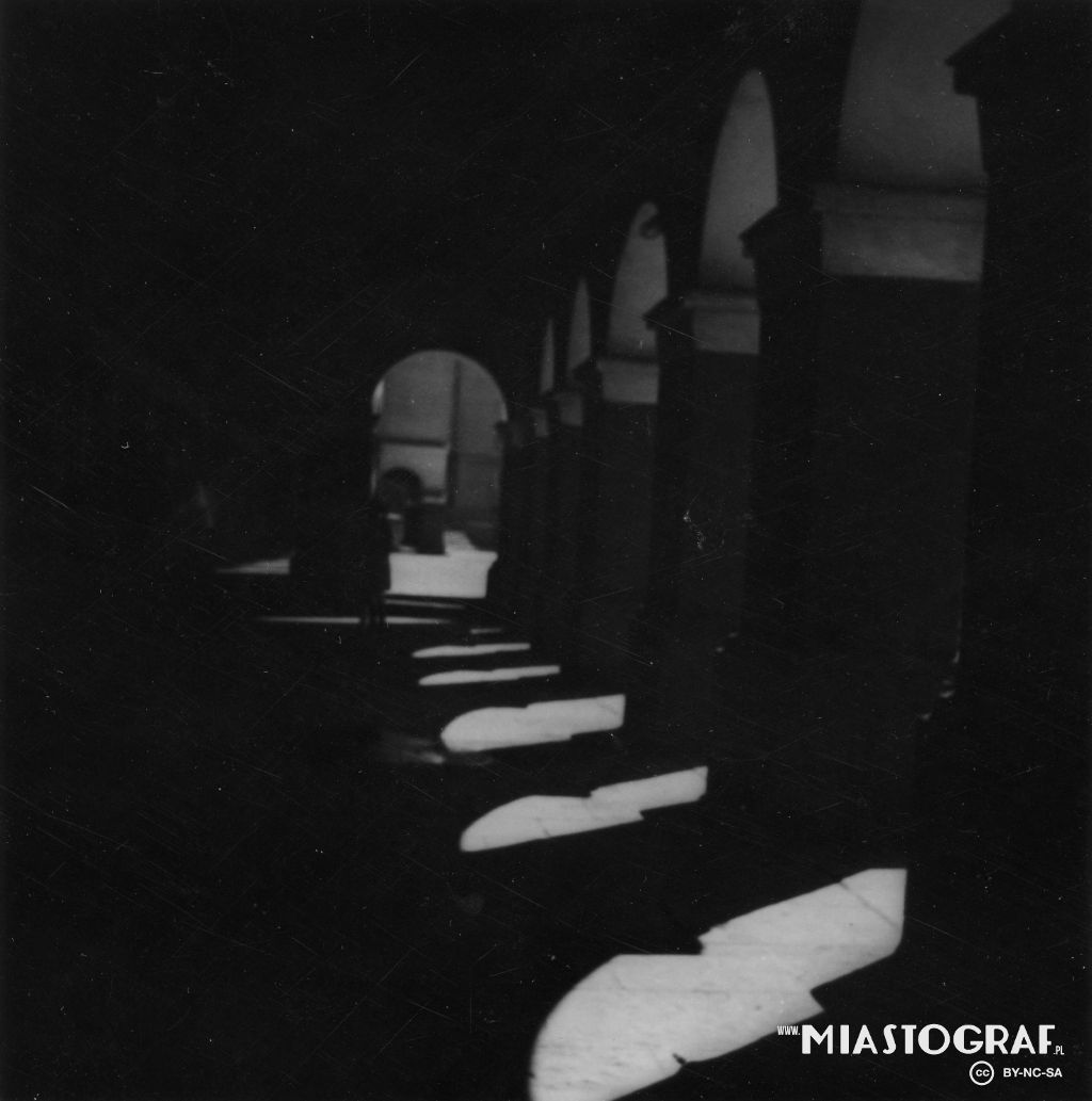 Nieistniejące podcienia Grand Hotelu. Widok od strony ul. Traugutta w Hotelową. W głębi widoczny fragment Willi Trianon przy Moniuszki 5, po lewej fragment budynku YMCA. Wacław Łukaszewicz uwieczni...