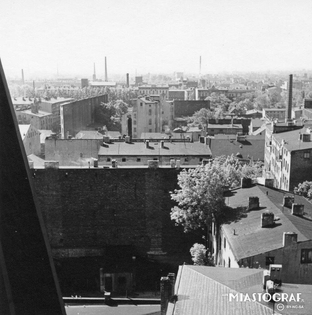 Widok z wieży kościoła św. Jana w str. południową miasta, na odc. ul. Głównej pomiędzy ul. Kilińskiego, a ul. Sienkiewicza. Komin i fr. budynku fabrycznego po prawej str. to dawna fabryka Józefa Balle’a, która produkowała taśmy gumowe. Widoczne fronty kamienic to zabudowa południowej pierzei ul. Orlej.