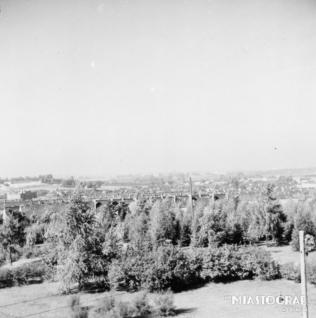 Panorama Łodzi z parku im I. Krasickiego dz. M. Zaruskiego. Widoczne osiedle mieszkaniowe, wybudowane od podstaw przez Niemców w czasie II wojny, posiada typowo niemiecką architekturę.