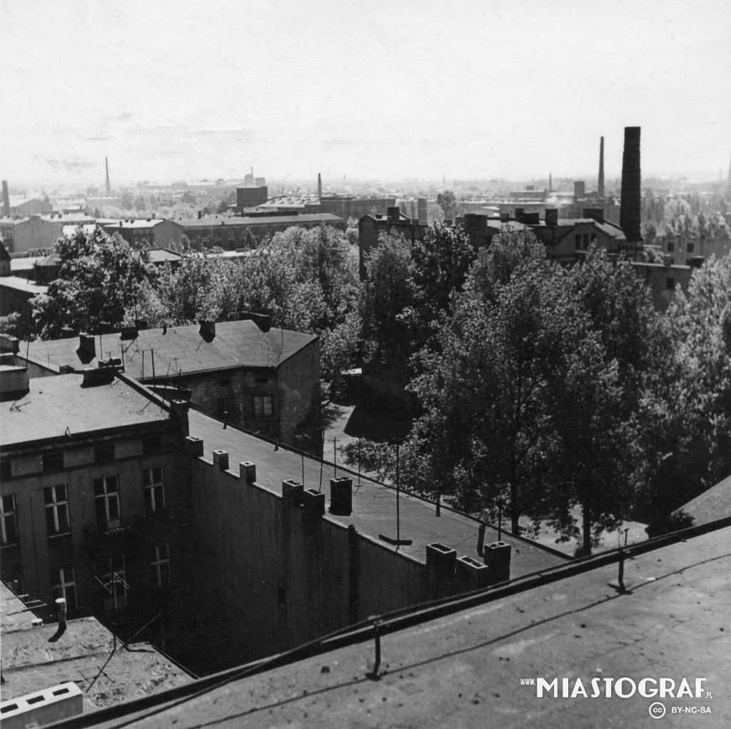 Widok z "Adasia" na dachy domów przy ul. Piotrkowskiej 177 i 179 w dali al. Kościuszki, widoczny dom partii.