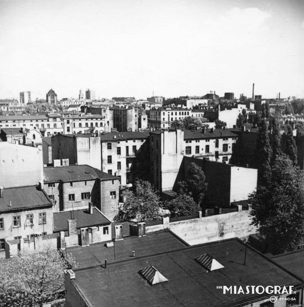 Widok z wieży kościoła św. Jana. W dali widoczna narożna kamienica Kilińskiego 80 / Tuwima 40 i kompleks elektrociepłowni Ec1. W środku zdj. widoczna oficyna z ul. Sienkiewicza 58 i dawny kościół bapt...