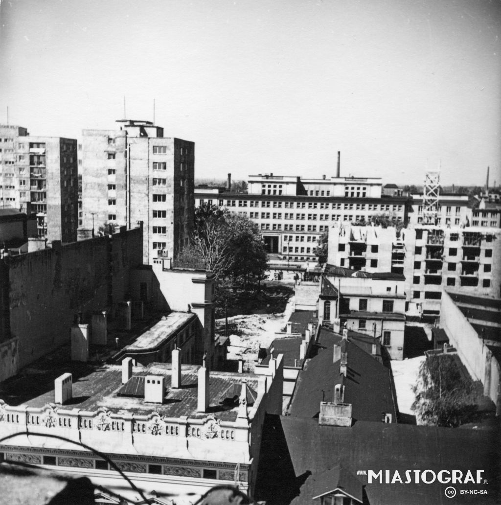 Widok z "Adasia" na dachy domów przy ul. Piotrkowskiej 177 i 179 w dali al. Kościuszki, widoczny dom partii.