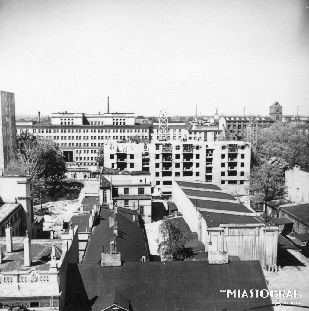 Widok z "Adasia" w kierunku wschodnim. U dołu widoczny dom i zabudowania ul. Piotrkowskiej 169, a na drugim planie gmach PZPR-u i wieżę fabryki A. Daubego.