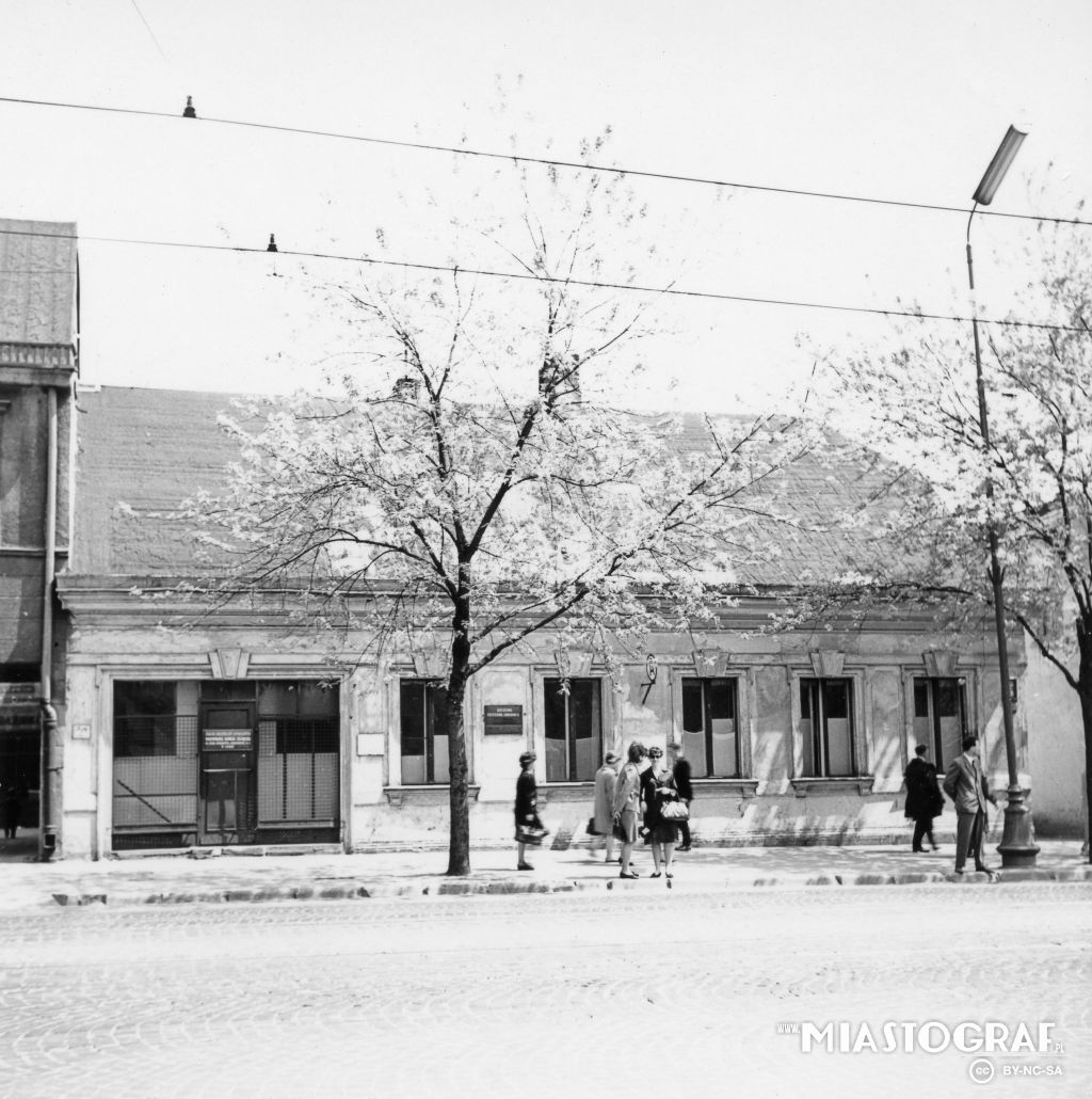 Widok z parzystej strony ulicy na posesję pod nr 175a. Parterowy, murowany dom frontowy wybudował w 1829r. Jan Adamowski, właściciel szynku wystawionego w 1824 r. na Nowym Rynku 16 (ob. pl. Wolności ...