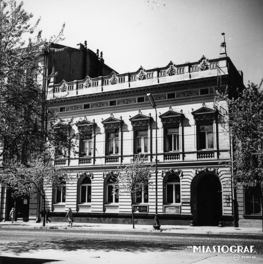 W głębi siedziba PWSFTv i T im. Leona Schillera w Łodzi. To dawny pałacyk łódzkiego przemysłowca Oskara Kona, właściciela Widzewskiej Manufaktury.